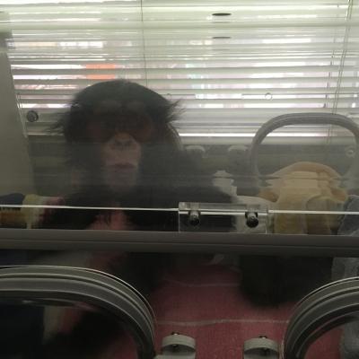 ICUには前日骨折の手術をしたチンパンジーの子供がいました。
